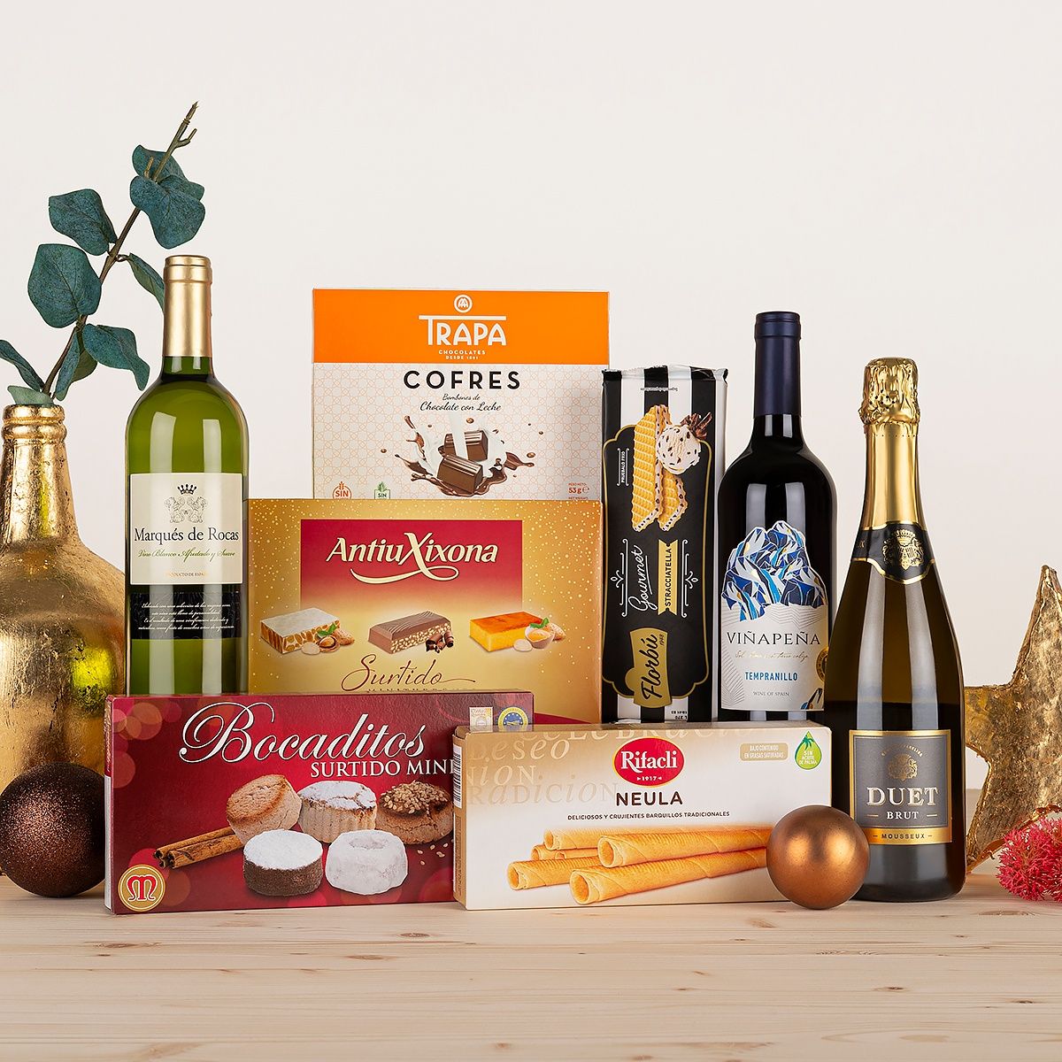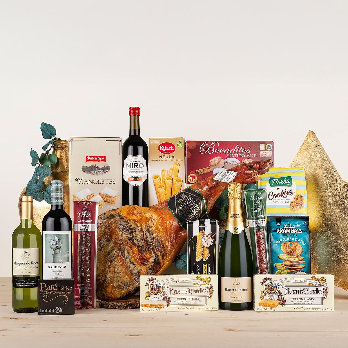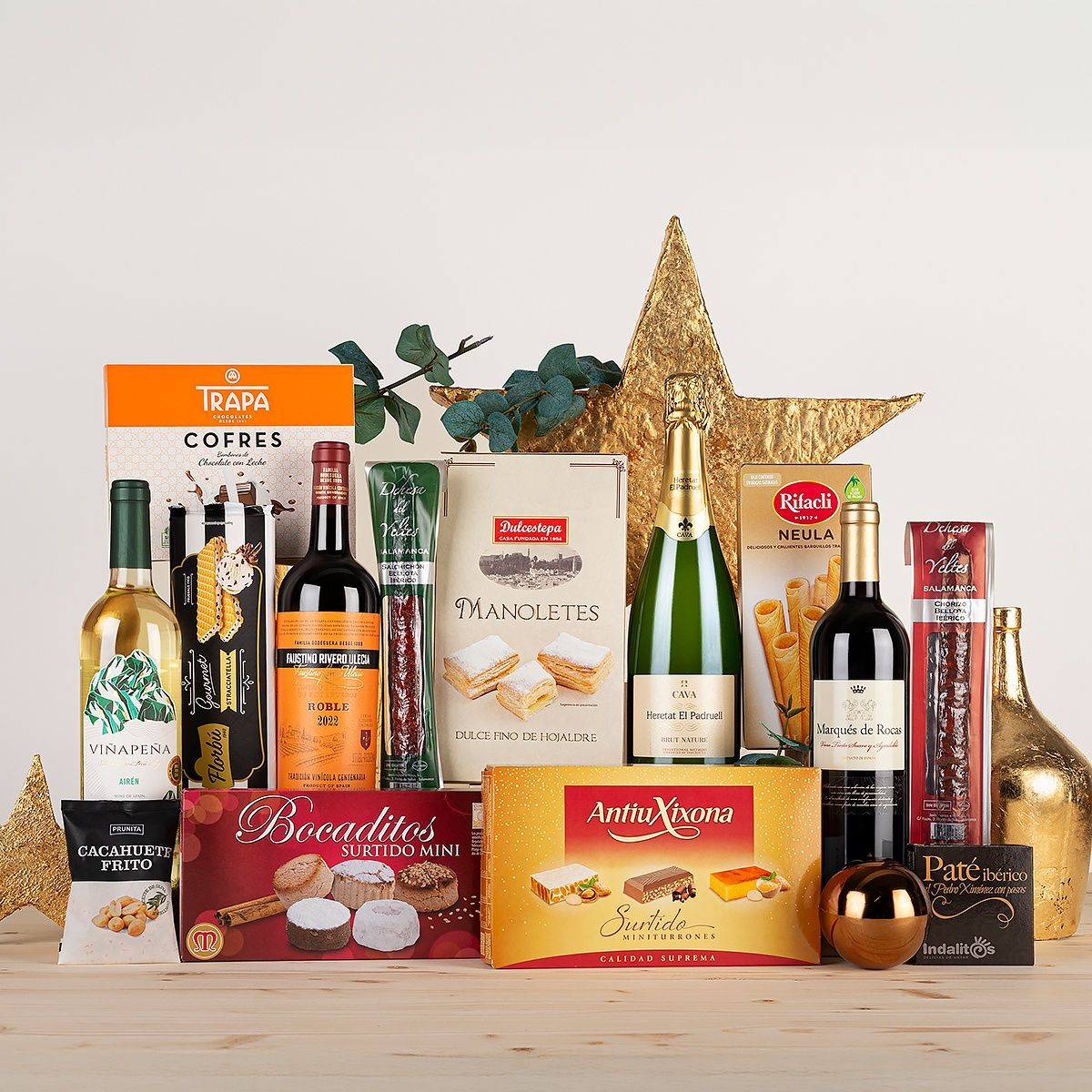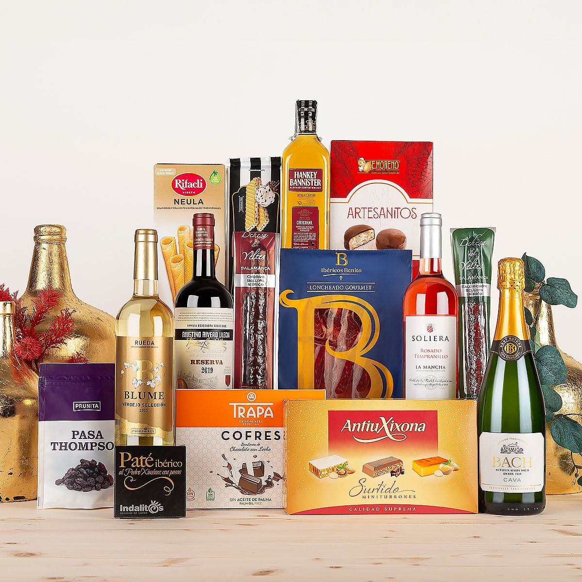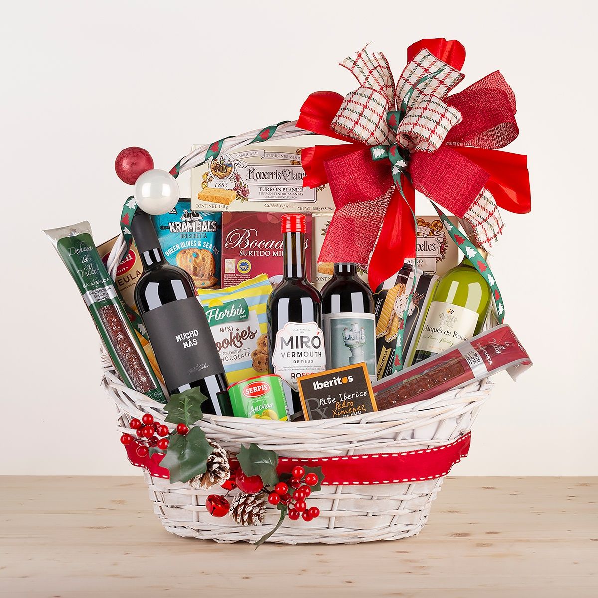Elegante cesta de Navidad con vermouth, vino, Chorizo Ibérico y dulces